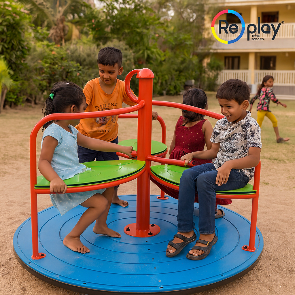 Merry-Go-Giggle is a compact and engaging three-seater merry-go-round designed to bring laughter and shared excitement to young children. Its smooth rotating platform and comfortable seating allow kids to enjoy safe spinning while developing balance, coordination, and social interaction. Built with a sturdy central post and easy-to-grip handrails, this equipment ensures stability, durability, and endless fun in a small footprint.