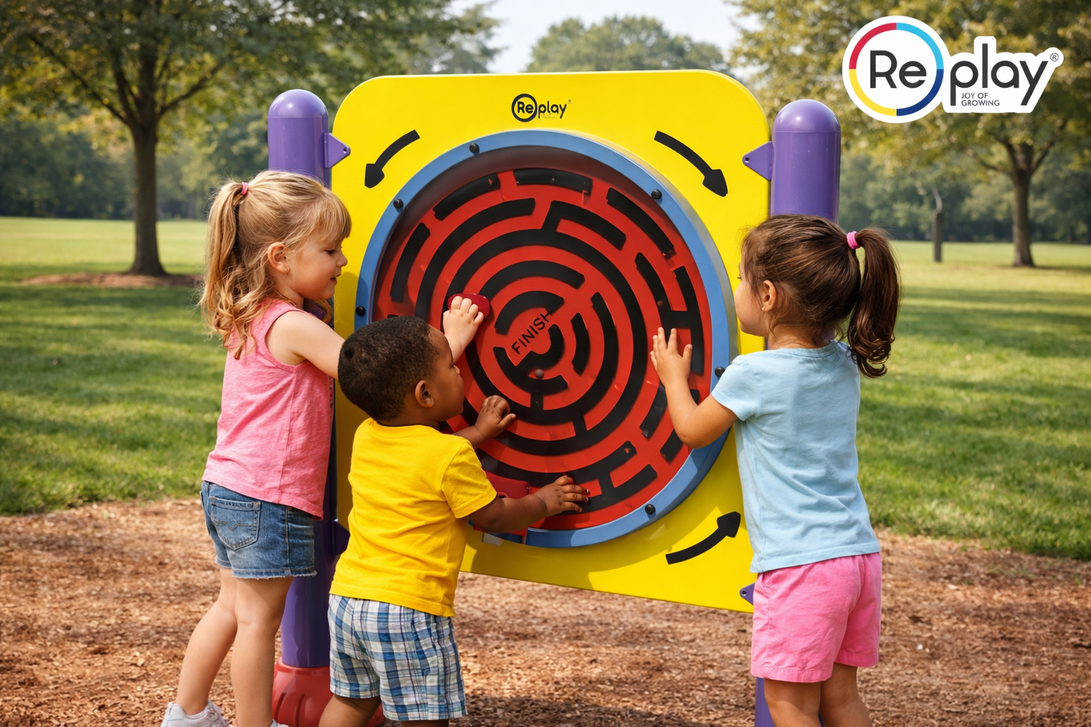The Adventure Board is an engaging interactive play panel designed to stimulate children's curiosity, problem-solving skills, and hand-eye coordination. Featuring a circular rotating maze with directional arrows and a finish point, children can navigate the internal path by rotating and controlling the maze element. This encourages cognitive development, concentration, and motor skills while providing fun and educational play. Its bright colors and durable construction make it a perfect addition to both indoor and outdoor play environments.