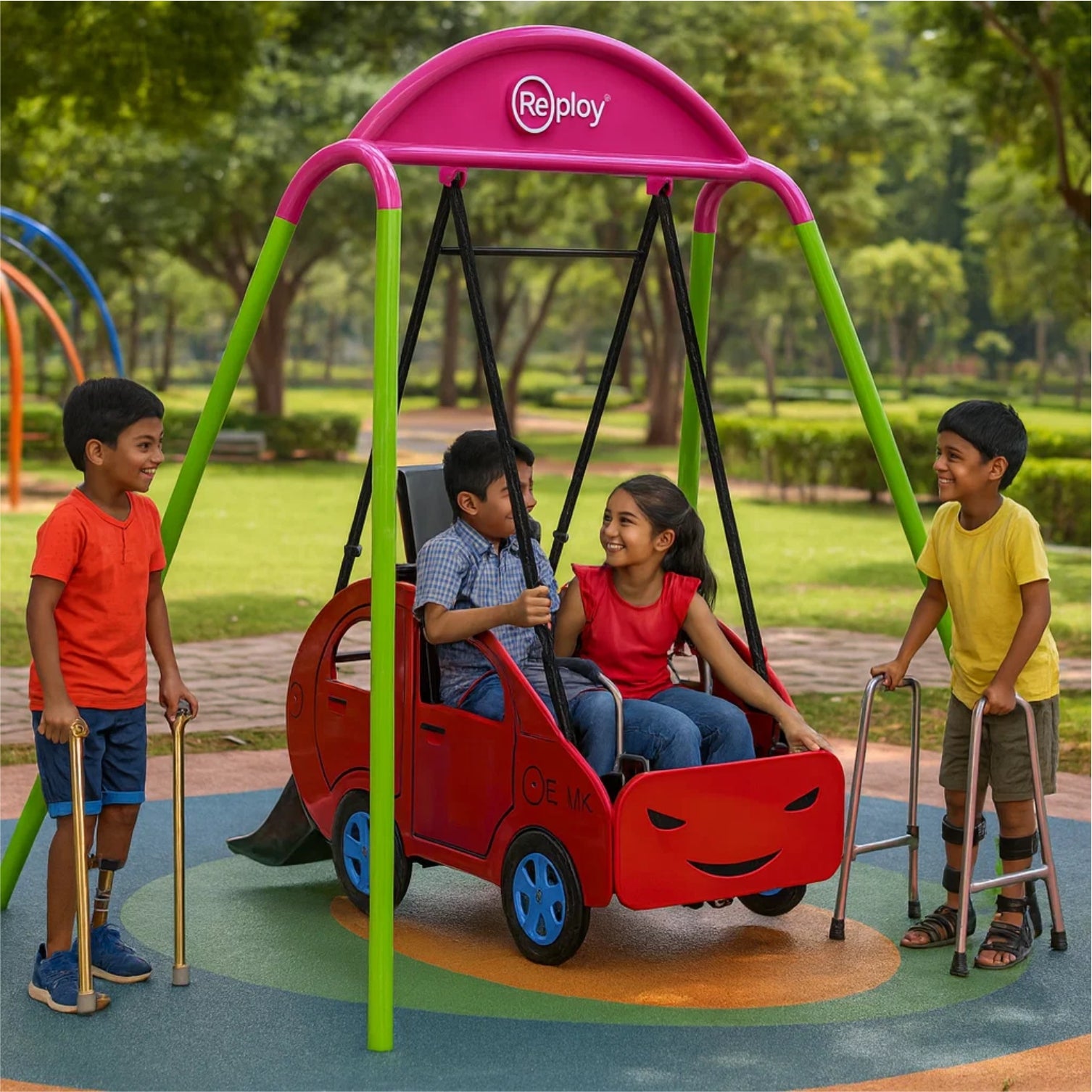 Take playground excitement to new heights with the Gondola Swing IP-28-SW, an extraordinary play attraction designed to deliver a thrilling yet safe swinging experience. Inspired by the charm of a moving gondola and creatively styled with a playful car theme, this swing transforms traditional swinging into an imaginative and immersive adventure.